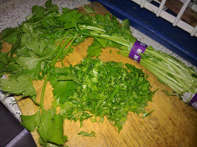 didalam bekas, campurkan kentang yang telah ditumbuk, daging kisar, daun sup, bawang goreng dan juga garam, gaul rata